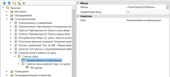 Рассмотрим пример настройки пользовательского шаблона выноски для выведения данных о конфигурации участка кабельной трассы и номерах групп кабелей, проложенных на этом участке и сгруппированных по щитам (рис. 12).