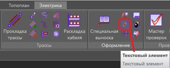 - Текстовый элемент (для вызова нужно выбрать в ленте команду Текстовый элемент на вкладке Электрика (рис. 4) или ввести CW_ADD_TEXT_ELEMENT в командной строке). Текстовый блок без выносной линии, который можно устанавливать с привязкой на кабельных трассах. Используется для создания различных надписей, подписей, обозначений кабельных трасс.