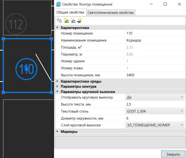 - Круговые выноски помещений – выноски, выводящие номер помещения и существующие в составе объектов типа «Контур помещений». На рис. 7 представлен пример такой выноски: параметры помещения заданы в свойствах, а его номер выводится автоматически.