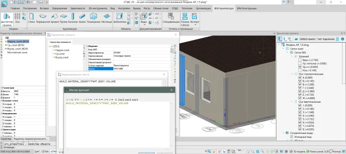 Для автоматического подсчета массы панелей через инструмент Расчет площади и объема 3D-объекта подсчитываем объем, а затем в свойствах задаем формулу для подсчета массы.