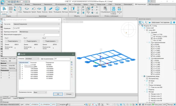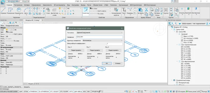 Независимо от среды проектирования, работа всегда начинается с настройки сетки осей и уровней. При создании нового файла в пространстве nanoCAD BIM Строительство уже находится базовая сетка осей, которую можно удалить и создать новую для дальнейшей работы или же отредактировать через инструмент Параметры сетки в диалоговом окне Свойства координатной сетки.