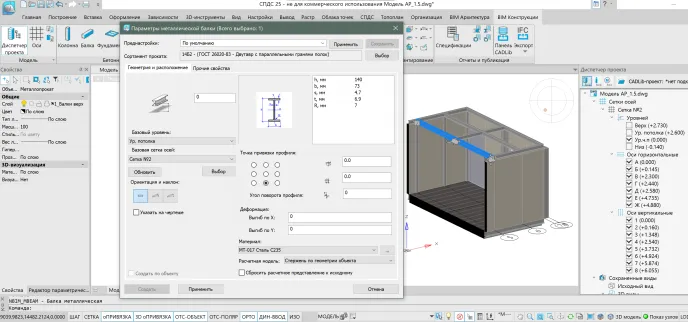 Работа с данным инструментом осуществляется через плавающий диалог, в котором можно выбрать сортамент металлопроката и задать: привязки верха и низа колонны к уровням, базовую сетку осей, ориентацию и наклон относительно вертикальной оси, точку привязки сечения, угол поворота профиля, выгибы по осям X и Y, материал, а также выбрать расчетное представление объекта.