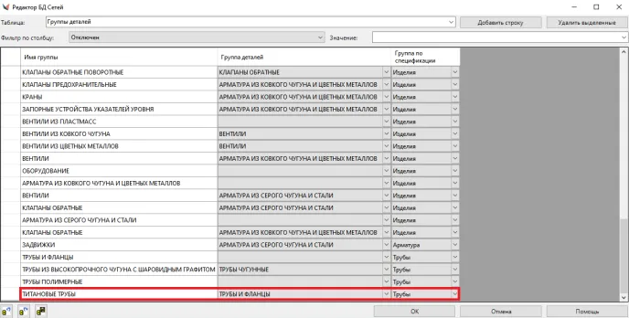 Теперь, используя только что добавленный материал, создадим новую группу в таблице Группа деталей. Это одна из таблиц, из которой берутся данные для оформления спецификации. Назовем новую группу ТИТАНОВЫЕ ТРУБЫ (рис. 7). Определим, что они относятся к элементу этой же таблицы – ТРУБЫ И ФЛАНЦЫ, выбрав их из выпадающего меню в столбце Группа деталей. Определим в выпадающем меню группу по спецификации – Трубы. Корректное заполнение данных в этих столбцах позволит при дальнейшей работе получить правильно заполненную спецификацию.
