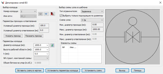 После добавления файла с отображением узла и привязки этого файла к элементам таблиц БД новая схема узла станет доступна для выбора при использовании Редактора схемы узлов колодцев. Как видно на рис. 16, подхвачены отрисованное нами ранее отображение схемы узла колодца и параметры, связанные с этим отображением в БД.
