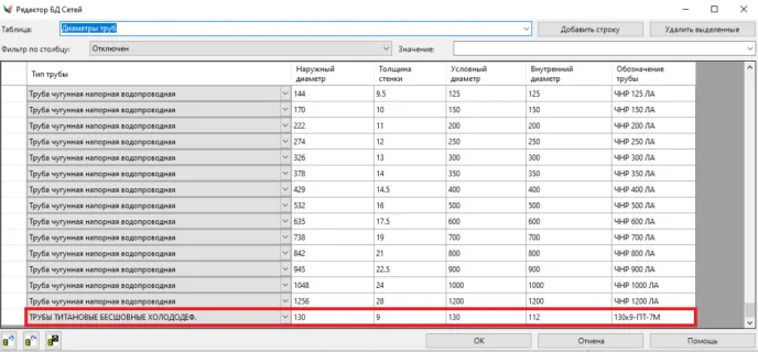 Перейдем в таблицу Диаметры труб и зададим нашей новой трубе геометрические параметры, такие как наружный и внутренний диаметры, толщину стенки, условный диаметр (рис. 9). Введем обозначение для трубы.
