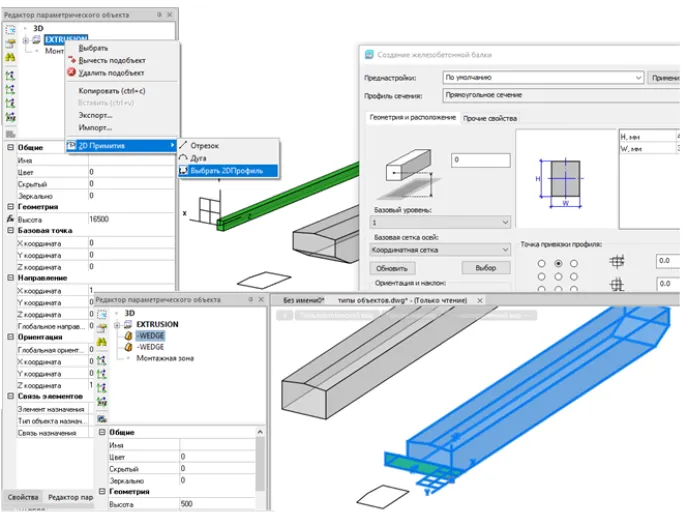 Этот режим моделирования компенсирует некоторые ограничения возможностей встроенного в nanoCAD BIM Строительство редактора параметрического оборудования. В качестве траектории тела вытягивания может использоваться любой примитив Платформы, в том числе 3D-полилиния и спираль. Все нюансы работы в режиме параметрического 3D-моделирования хорошо задокументированы в справке Платформы nanoCAD.