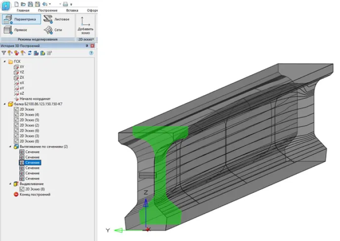 Пример использования этого режима – построение тел вытягивания с плавным переходом от одного сечения к другому: балок двутаврового сечения по серии 3.503.1-81 (рис. 12).