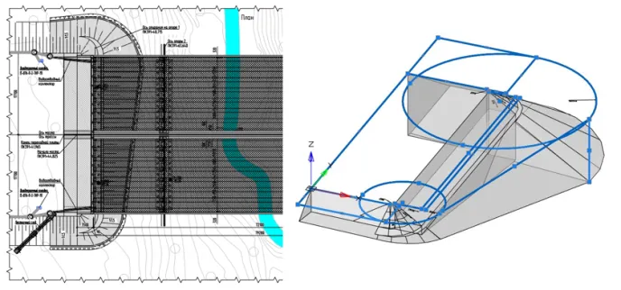 Пример конструкций, выполненных в режиме прямого 3D-моделирования, – откосы моста (рис. 10). Откос собран из тел вытягивания по сечениям, тел выдавливания, примитивов клиньев и объединен в один объект булевыми операциями.