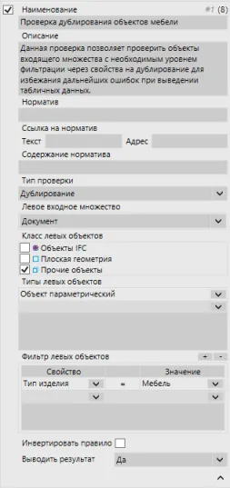 Как можно видеть, в этом правиле используется только одна группа объектов – Левое множество. В качестве отбираемых объектов выберем Прочие объекты, в этот класс входят также и объекты BIM Строительство. После отбора класса объектов, выбираем Тип – Объект параметрический, а также дополнительно настраиваем фильтр отбора объектов, в виде свойства объекта и его значения.
