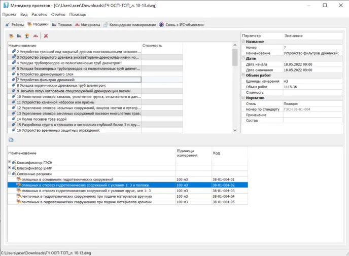 Основным инструментом программы nanoCAD Стройплощадка является уже знакомый нам Менеджер проекта. С его помощью можно настроить все необходимые элементы. В первую очередь настраиваются объемы выполняемых работ с формированием перечня этих работ и расценки на них с привязкой к работам из перечня. Данные из Менеджера можно напрямую экспортировать в сметные программы (рис. 22).