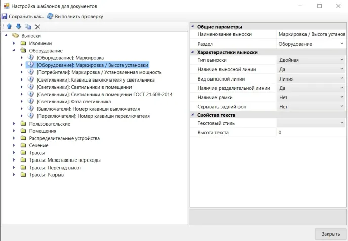 Для всех представленных выносок доступны стандартные настройки, выполняемые в окне настроек nanoCAD BIM Электро: