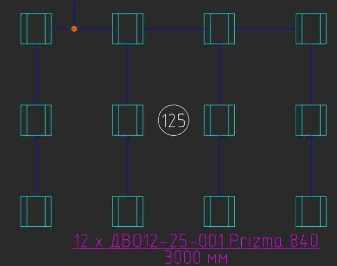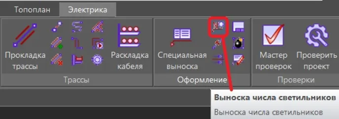 - Выноска числа светильников (для вызова необходимо выбрать в ленте команду Выноска числа светильников на вкладке Электрика (рис. 2) или ввести EL_ADD_LIGHT_COUNT_NOTE в командной строке). Позволяет массово выделить на плане однотипные светильники и сформировать к ним выноску с указанием их количества, типа, высоты установки (на рис. 3 представлен пример выноски к двенадцати светильникам типа «ДВО12-25-001 Prizma 840», установленным на высоте три метра). Этот тип выносок не поддерживает обновление после установки на чертеже (то есть при увеличении или уменьшении числа светильников выноска останется неизменной, для обновления потребуется установить ее повторно).