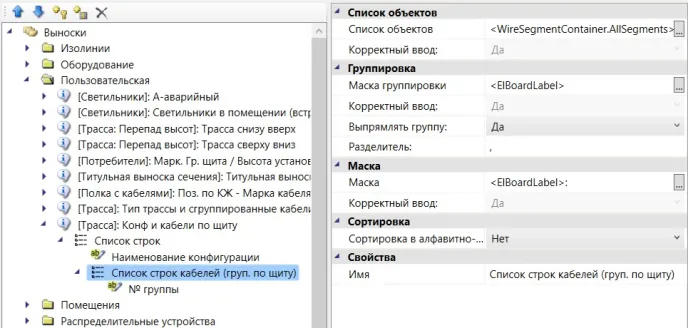 - «Список строк кабелей (груп. по щиту)» (рис. 15) обеспечивает как вывод в каждой строке (при включении функции Выпрямлять группу) данных, сгруппированных по строкам, расположенным ниже уровнем (№ группы), так и вывод данных о питающем щите по маске