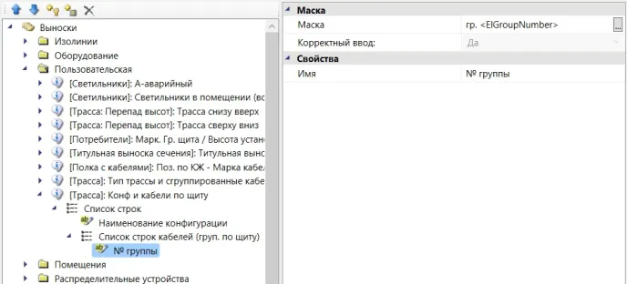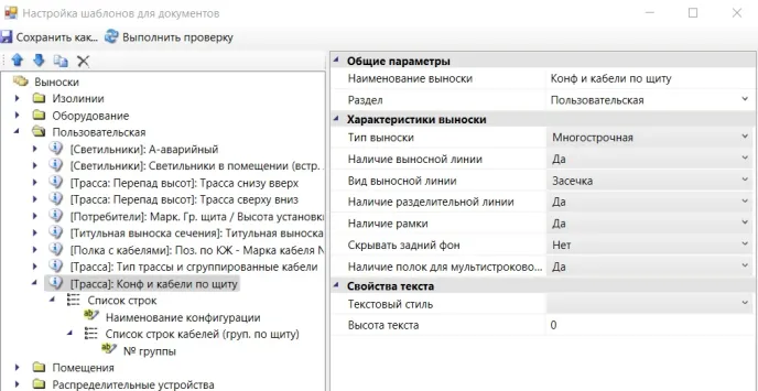 Рассмотрим пример настройки пользовательского шаблона выноски для выведения данных о конфигурации участка кабельной трассы и номерах групп кабелей, проложенных на этом участке и сгруппированных по щитам (рис. 12).