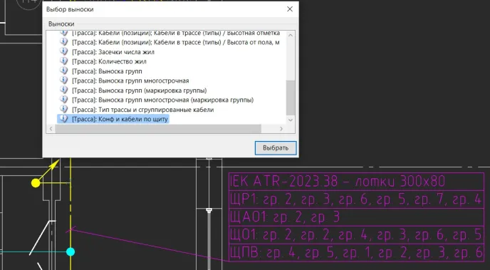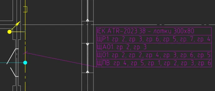 - далее построчно выводятся сгруппированные по щитам данные о кабелях, проложенных на участке трассы. Например, в третьей строке выноски указано: «ЩАО1: гр. 2, гр. 3», где «ЩАО1» – маркировка щита «Щит аварийного освещения 1», к которому подключены два проходящих по трассе кабеля, подключенных к «гр. 2, гр. 3», то есть к группам 2 и 3 щита ЩАО1 соответственно.