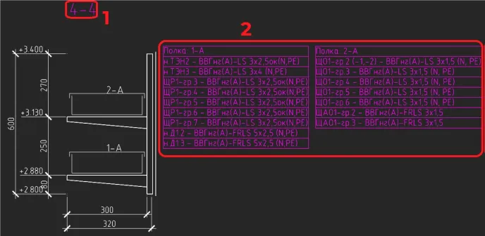 4. выноски заголовка сечения кабельной трассы и кабелей, проложенных на этих сечениях.