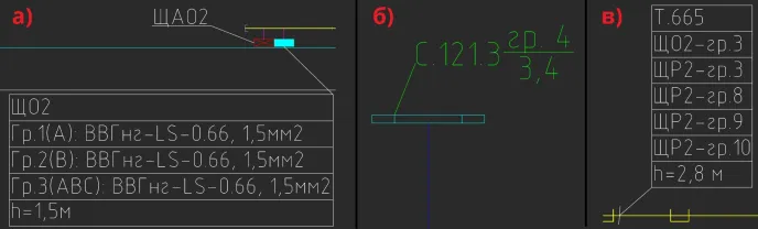 Используя специальные выноски, проектировщики могут быстро выносить нужную информацию на чертежи. При этом выводимые данные всегда остаются актуальными благодаря динамической, основанной на преднастроенных шаблонах связи параметров объектов с установленными выносками. Примеры применения подобных выносок демонстрируются на рис. 8. Коротко прокомментируем содержание этого рисунка: а) выноска маркировки щита ЩАО2 и щита ЩО2 с выведением данных об активных группах подключения и типах кабеля, подключенных на эти группы, а также данных о высоте установки щита ЩО2; б) выноска маркировки светильника С.121.3, подключенного на группу 4 питающего щита и установленного на высоте 3,4 м; в) выноска с наименованием участка кабельной трассы, высотой прокладки кабельной трассы и с обозначением щита и его группы подключений, на которую подключен проложенный в трассе кабель.