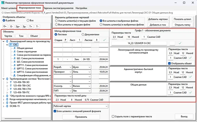 - программа формирует дерево объекта: его наименование, обозначение тома, входящие в том листы и/или документы;