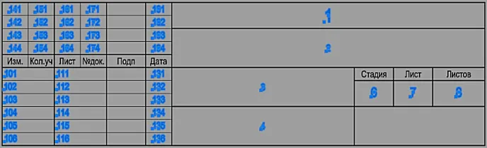 Атрибут имеется в каждой графе основной надписи. В графах 2-4, согласно ГОСТ Р 21.101, атрибуты многострочные, в остальных – однострочные. Имена атрибутов имеют минимально возможное количество символов, которые присваиваются по номеру графы и, при необходимости, номеру строки данной графы.