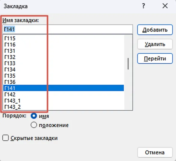 Порядок присвоения закладкам имен сводится к следующему. Имя закладки не может начинаться с цифры, поэтому вначале ставится буква Г (Графа). Далее идет номер графы: Г2, Г3, Г4. Многие графы имеют по несколько строк; в таком случае для графы 10 первая строка будет представлена как Г101, вторая – Г102 и т.д. (рис. 4). Нумерация строк – сверху вниз.
