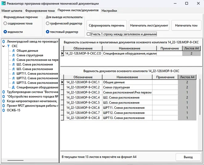 Программа «Реквизитор» поддерживает оба возможных варианта оформления томов: и листами, и документами. При переключении между ними нумерация пересчитывается автоматически. Но применительно к томам ОПС и СКС следует использовать оформление документами.