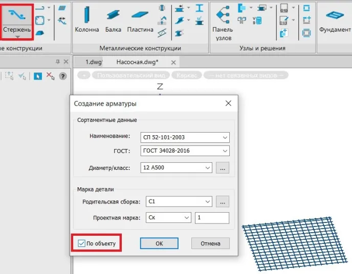 4. Вызываем команду Создать арматурный стержень и устанавливаем галочку По объекту (рис. 25).