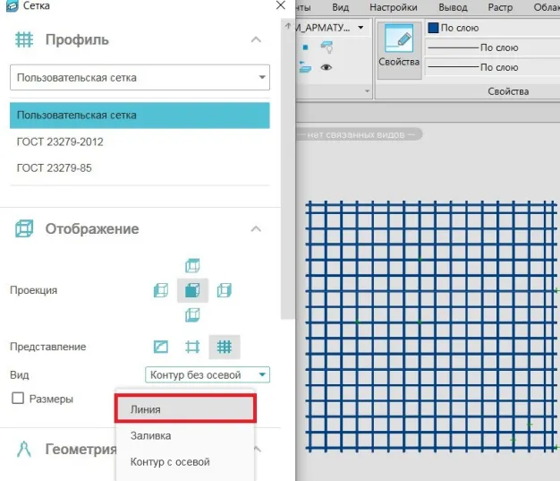 1. В программе nanoCAD Металлоконструкции выбираем сетку, а затем задаем в Редакторе сетки Вид ⇒ Линия (рис. 23).