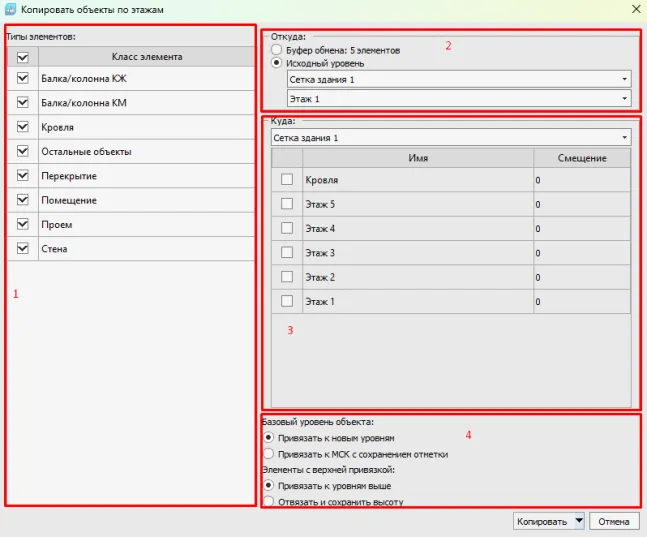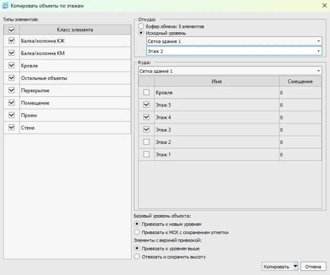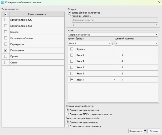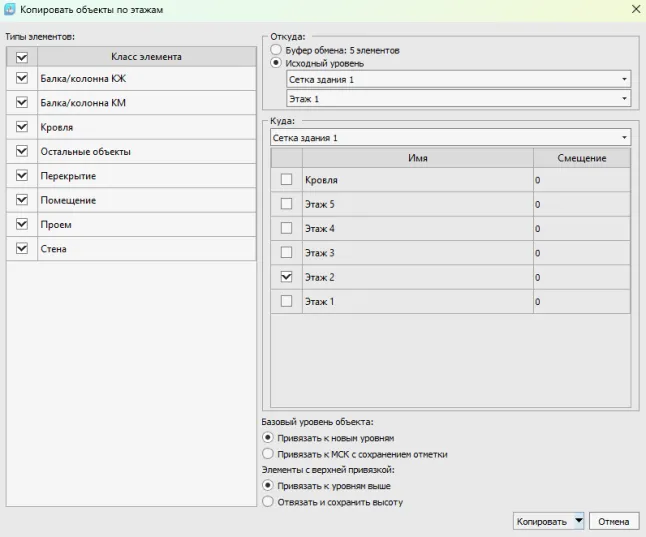 2. Выбор источника копируемых элементов. Буфер обмена – объекты, скопированные инструментом «Копировать» с возможностью переноса элементов между файлами. Исходный уровень – копирование или перенос элементов в рамках одной модели с выделенного уровня сетки осей.