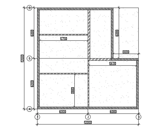 В качестве демонстрационного примера возможностей ПО и ускоренного закрепления информации построим относительно небольшую модель средствами программы. Построим первый этаж, начиная с перекрытия и несущих стен и опираясь на представленный план (рис. 1). Толщина перекрытия – 800, толщина стен – 250 и 120. Привязка стен снизу к осям «этаж 1», привязка стен сверху к осям «этаж 2» со смещением 200.