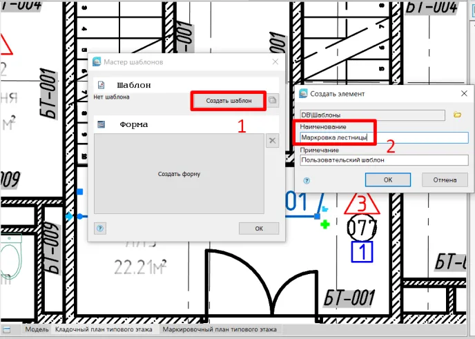 Открывается окно Мастер шаблонов (рис. 19), где мы нажимаем кнопку Создать шаблон (рис. 19, п. 1). В следующем окне Создать элемент указываем имя нашей выноски (рис. 19, п. 2), при необходимости можем сделать примечание в соответствующем поле.