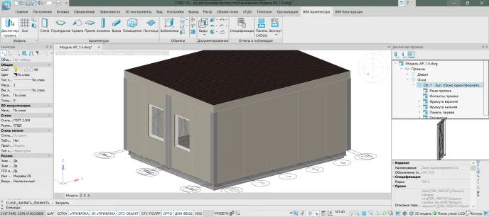 Предприятие «СПЕЦ Прожект групп» (Бронезавод «АПИТ»), при проектировании и производстве модульных зданий, периодически сталкивается с необходимостью решения вопросов интеграции архитектурно-конструкторских решений проектируемых модульных конструкций с существующей компоновкой инженерных систем особенно на ранних стадиях проектных работ для исключения коллизий. Ключевым требованием была скорость адаптации типовых проектов под нужды конкретного технического задания (ТЗ) и минимизация ошибок при передаче данных между смежными отделами. Для организации проведения пилотного проекта был выбран типовой блок-модуль общественного назначения габаритами 6x4,9 м. с реализацией проектирования на базе программного обеспечения nanoCAD BIM Строительство — продукт российской компании «Нанософт». Его компактность и типовая структура идеально подходит для отработки методики создания параметрических библиотечных элементов, как последующей основы для проектирования иных модульных зданий из линейки, выпускаемых предприятием.