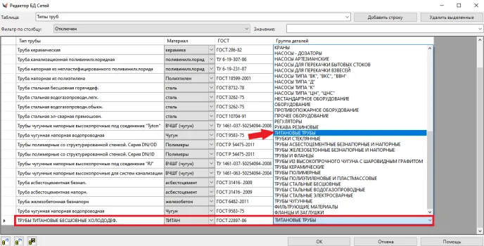 Далее перейдем в таблицу Типы труб и, добавив строчку, создадим новый элемент БД: ТРУБЫ ТИТАНОВЫЕ БЕСШОВНЫЕ ХОЛОДОДЕФ, по ГОСТ 22897-86. В столбцах Материал и Группа деталей выберем в выпадающем меню введенные нами ранее элементы, с которыми теперь установлена связь (рис. 8).