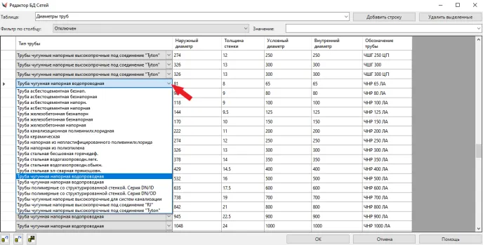 Используя команду Редактор, перейдем для дальнейшей работы в Редактор БД Сетей. Между компонентами БД поддерживается взаимосвязь. Так, добавляя новую трубу в другой таблице, мы можем выбрать ее из выпадающего списка (например, в таблице Диаметры труб) и привязать к ней новые параметры (рис. 4).