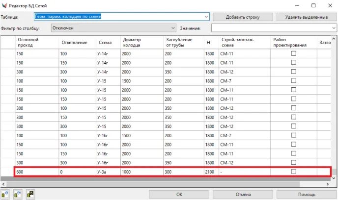 Затем следует перейти в таблицу Геом. парам. колодцев по схеме и внести необходимые параметры, создав связь между элементами БД, как мы делали это при добавлении трубы (рис. 15). Нужно отметить, что столбец Схема не оснащен выпадающим меню выбора ранее указанного имени узла, поэтому имя понадобится ввести вручную. Подобные столбцы есть и в других таблицах, важно обращать внимание на содержание ячейки и корректно заполнять ее по аналогии с другими.