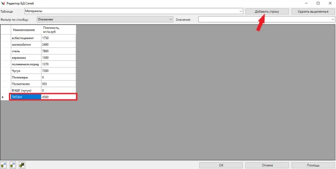 В процессе работы над проектами автор этих строк выработал определенный алгоритм действий при добавлении новой трубы. Давайте предположим, что нам нужно добавить новый тип труб из титана для эксплуатации в агрессивных средах. Перейдем в таблицу Материалы. Так как изначально титана в ней нет, нужно его добавить. Для добавления элементов в БД используем кнопку Добавить строку в верхней правой части окна, а затем просто вводим необходимый текст в ячейки таблицы. Задаем название нового материала (ТИТАН) и его плотность. Вот и всё, новый элемент внесен в базу, никаких иных манипуляций производить не требуется (рис. 6). С этого момента при добавлении новых труб вы можете выбирать титан как материал, из которого они изготовлены.