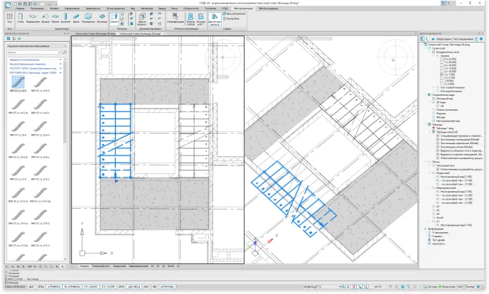 В библиотеку включены готовые лестницы, пандусы, площадки, ступени и ограждения по каталогам.