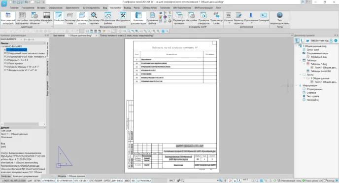 Лист общих данных комплекта создан на основе специального шаблона, что обеспечило автоматическое заполнение главного штампа в соответствии с заранее настроенными свойствами комплекта.