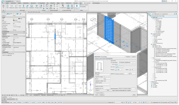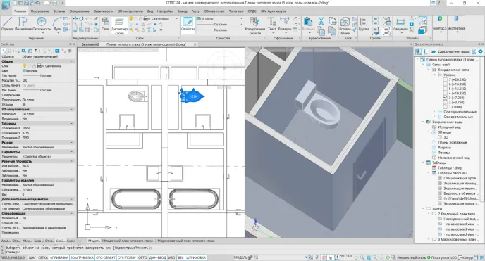 Объекты библиотеки имеют 2D- и 3D-представление и корректно отображаются в объемной модели и на плане.