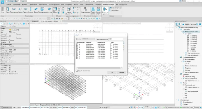 Работа начинается с создания и настройки сетки осей, к уровням которой привязываются все объекты модели.