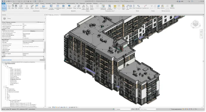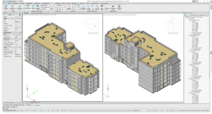 Модели остальных этажей и кровель на разных отметках выполнены корректировкой модели типового этажа в копиях ее файлов.