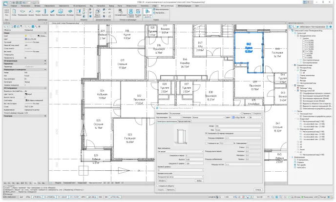 Через функциональную панель Свойства можно изменять для помещения номер, имя, категорию по пожарной опасности, категорию назначения, базовый уровень, видимость текстовой марки, стандартный для текстовых объектов набор параметров, точность отображения площади.