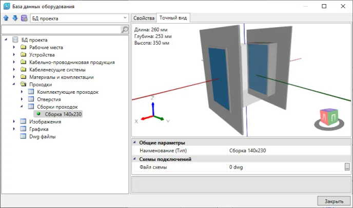 - Оборудование. Новая функция создания сборок кабельных проходок с возможностью их отображения как в 2D, так и в 3D-видах модели.