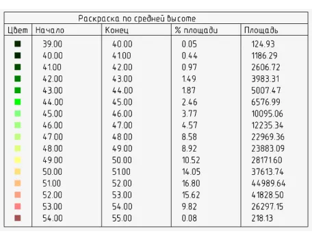 После построения поверхности возможен ее анализ. Доступны различные операции, которые могут быть актуальны для маркшейдера: создание сводной поверхности (вычитание), перемещение и масштабирование поверхности, врезка одной поверхности в другую. На рис. 4 показан участок поверхности, раскрашенный по диапазону высотных отметок с выводом легенды.