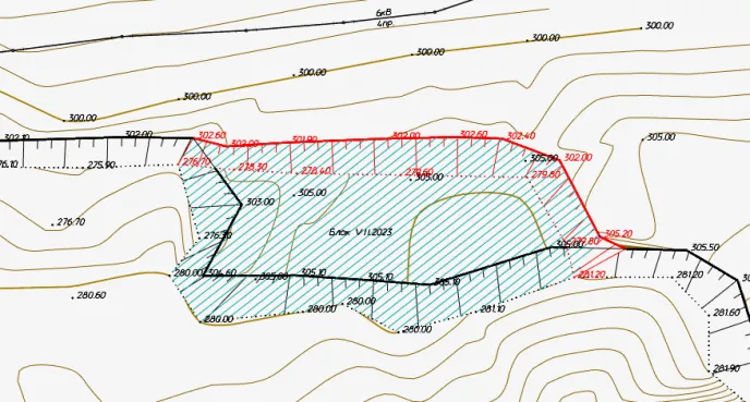Применение модуля «Топоплан» позволяет упростить оформление сводного плана горных работ. В программе есть инструменты, отрисовывающие штриховку бортов откосов. Вид штриховки полностью открыт для настройки.