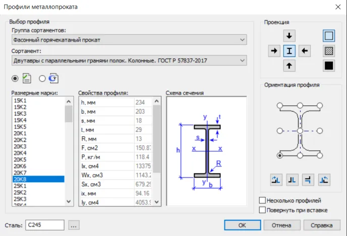 Встроенная база металлопроката с готовыми профилями (двутавры, тавры, уголки, швеллеры, листы, трубы и гнутые профили) по устаревшим и актуальным ГОСТ и ТУ показана на рис. 16.