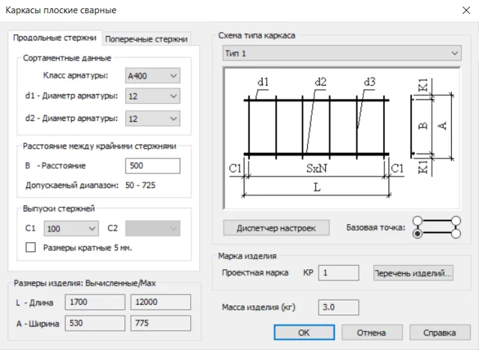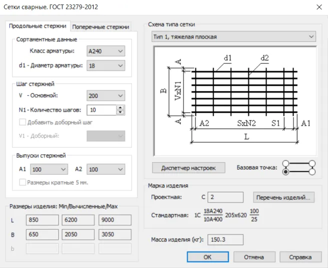 Арматурные изделия представлены плоскими каркасами, а также сварными сетками по ГОСТ. Отдельные окна настроек позволяют быстро разместить нужную деталь в проекте.