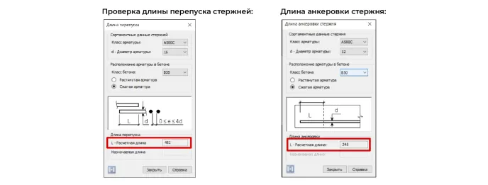 Окна проверки длины перепуска стержней и указания длины анкеровки стержня продемонстрированы на рис. 17 и 18.