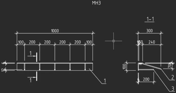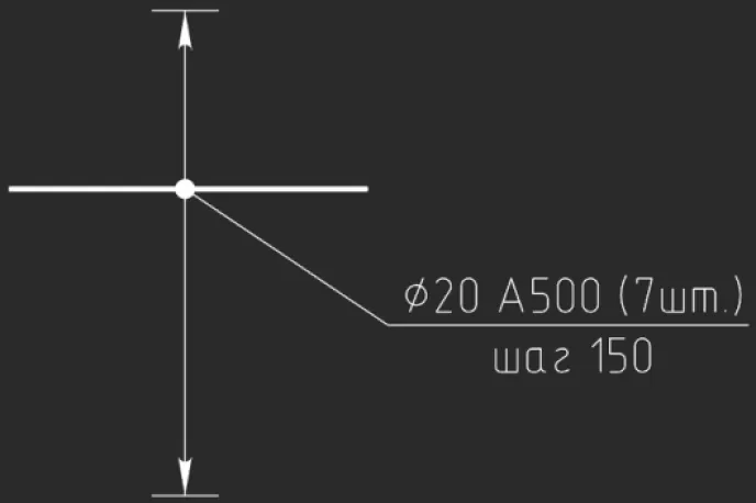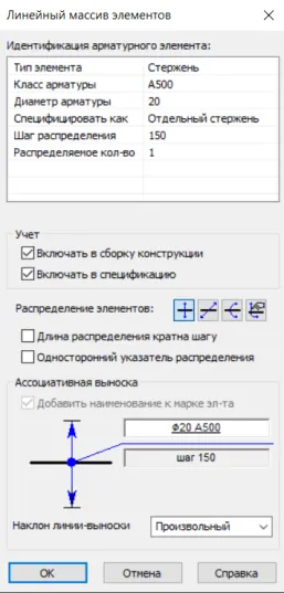 Характерный пример – арматура, размещаемая с указанием зоны распределения. Принцип построения таков: создаем одиночный стержень с помощью команды Линейный элемент, после чего предварительно настраиваем массив в отдельном окне (тип и диаметр арматуры, шаг, схему распределения и пр.). Как результат получаем условное обозначение и ассоциативную с массивом выноску. Количество стержней при этом высчитывается автоматически.