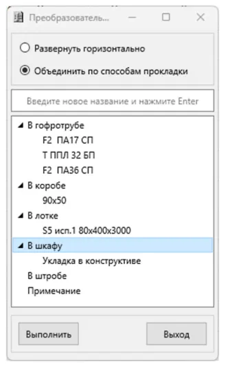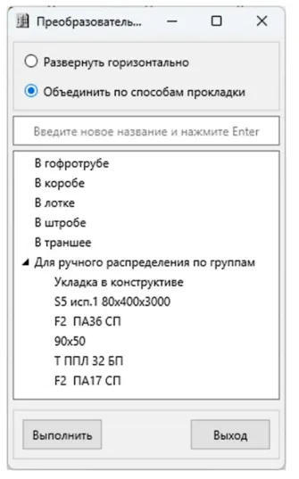 Если наименования конфигураций кабеленесущих систем не очень понятны или представлено множество похожих конфигураций, можно объединить их в группы. Для этого понадобится только установить переключатель в значение Объединить по способам прокладки (рис. 4).