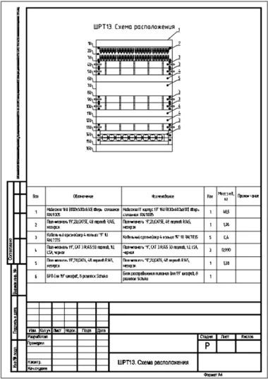 Для получения результата вычертите схему телекоммуникационного шкафа в программе nanoCAD BIM CKC или откройте ранее сохраненную схему в nanoCAD любой конфигурации. Нажмите кнопку Все подряд + рамка +…. Программа создаст схему, аналогичную представленной на рис. 8.